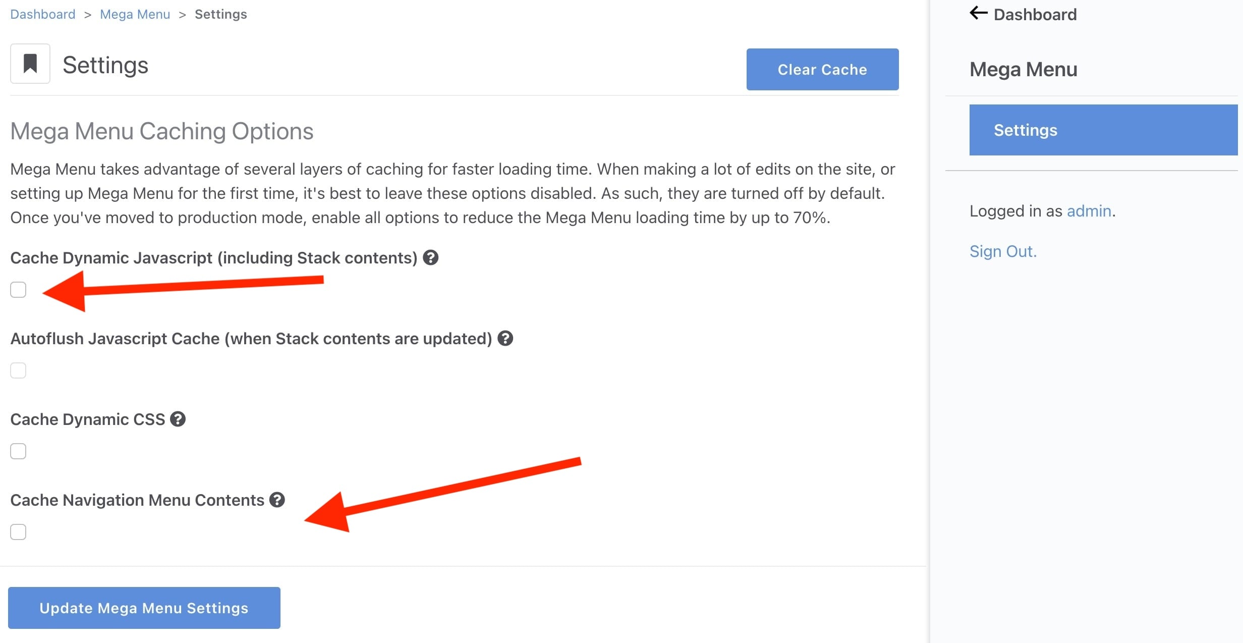 Advanced Mega Menu caching features are disabled by default. This ensures you see accurate content while building your site and making frequent changes. When you’re ready to “go live”, enable all caching options on the Mega Menu Dashboard page /dashboard/jb_megamenu/settings. See more caching documentation.