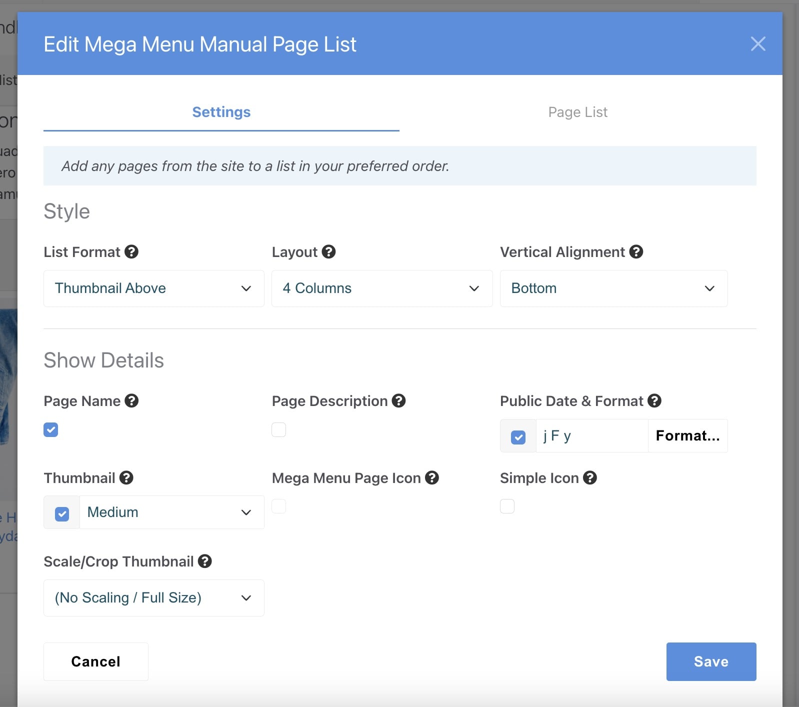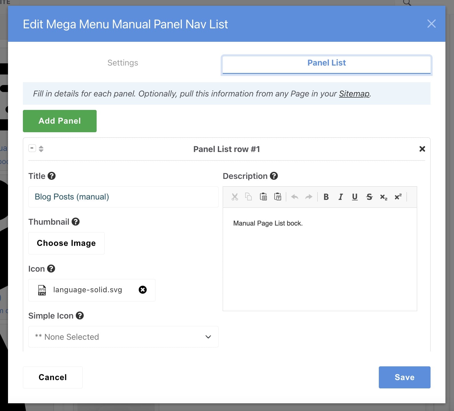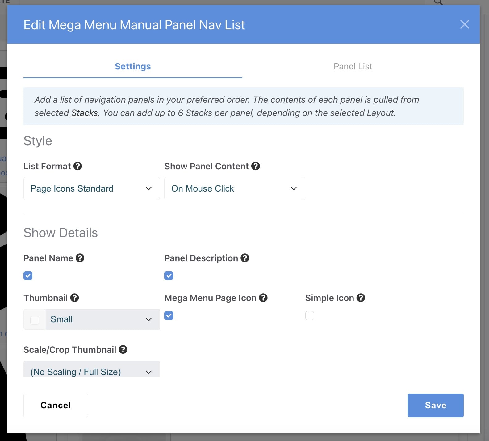 Display an icon next to the panel Title. The size and position of the icon will depend on the active Mega Menu skin (on Color tab). It is best to use simple images with a square ratio (SVG or PNG image format is preferred). This image will only be used if the List Format setting is “Page Icons Standard”.