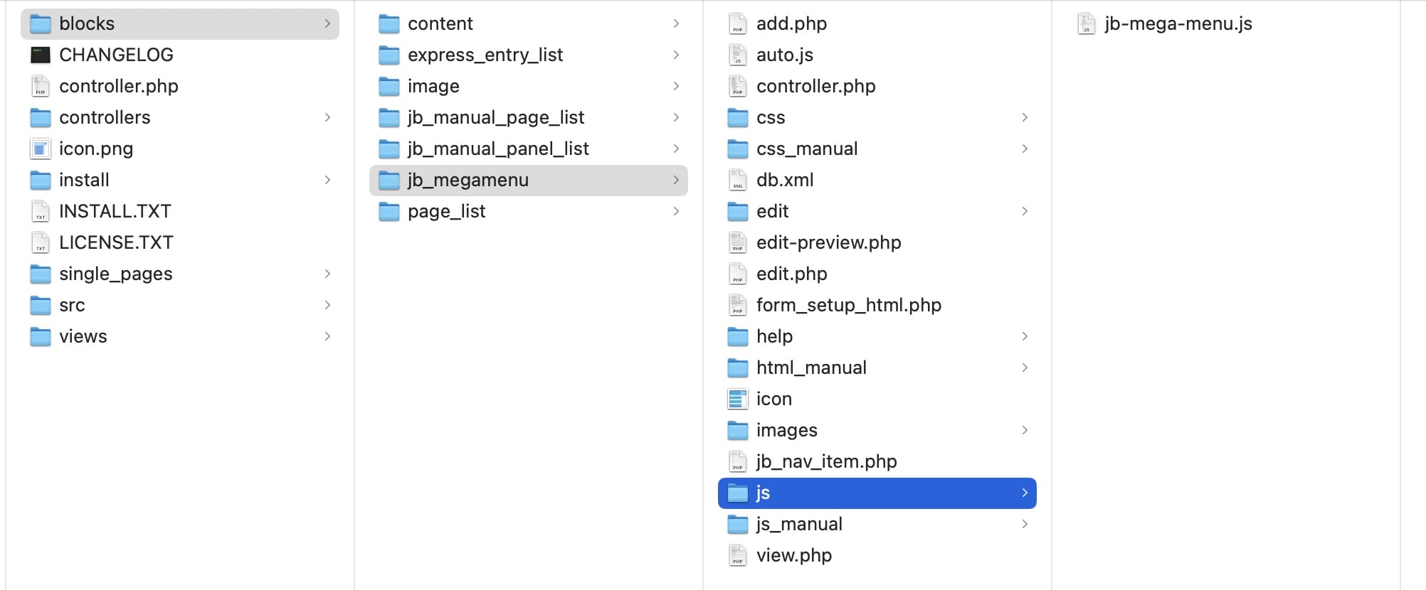 To get a better understanding Mega Menu’s inner workings, familiarize yourself with the file structure (all contents are in the /packages/jb_megamenu folder):