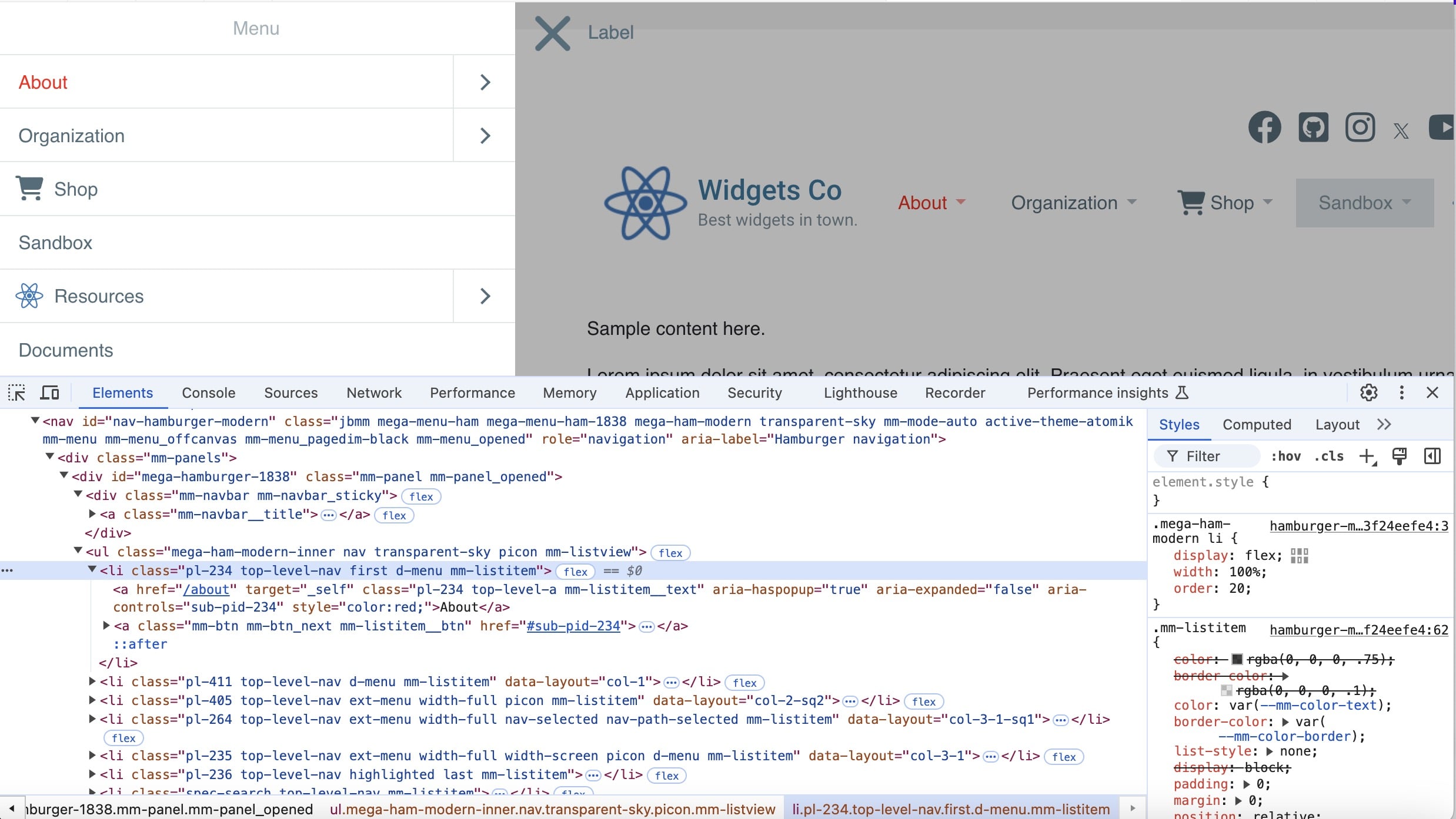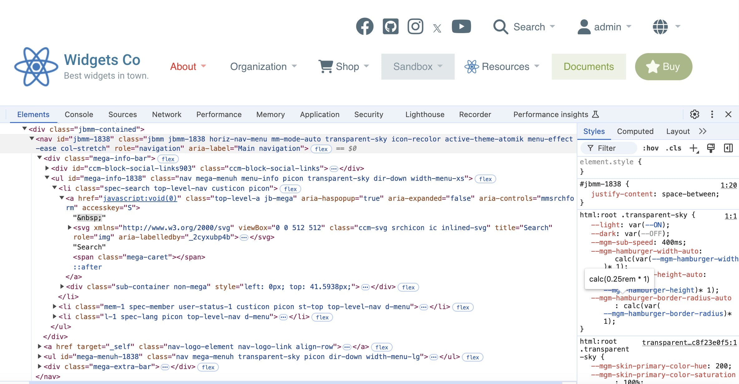 Mega Menu follows CSS best practices to ensure the code is robust and extendable. The base.css uses broader CSS selectors to allow easy overriding by skins, but is also specific enough to prevent conflicts with the active theme’s CSS or other blocks. Use of the “!important” property is avoided as much as possible to ensure code is logical and easy to understand. While Mega Menu strives to adhere to best practices, the potential for CSS clashes can never be completely eliminated when using blocks and themes created by different 3rd party developers for Concrete CMS. For suggested steps to investigate a potential CSS clash, see section: Troubleshooting.
