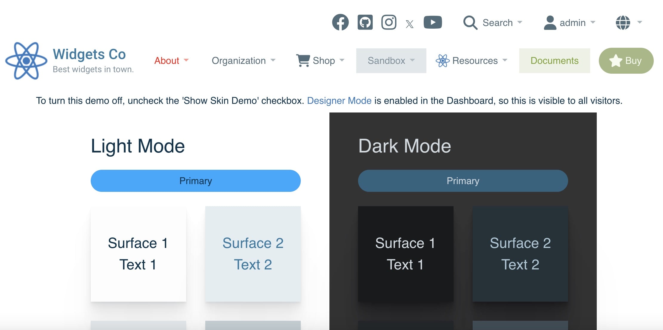 Designing your own Mega Menu skin can be a fun, creative process. To make it easier, the Color > Skin Show Skin Demo field, when enabled, displays a set of “surfaces” and text colors for the active modern skin (based on the selected or default Skin Primary Hue and Skin Secondary Hue) – but only while the page is in edit mode. This demo is automatically hidden when the page is no longer in edit mode, as you never want your website visitor to see this.