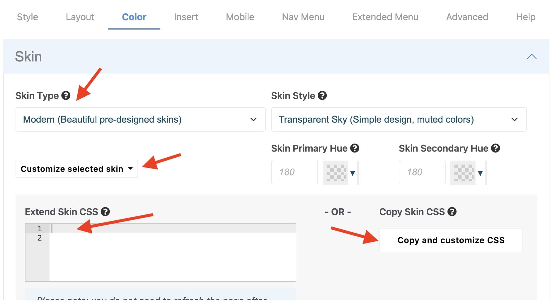 For full styling control, copy all the CSS code from the selected Modern Skin Style into the Custom CSS field. Click the Copy and customize CSS button and then modify the CSS code as you wish. This is easier than starting from scratch, while offering maximum flexibility and creative freedom. Intermediate CSS knowledge is required. Recommended for major changes to a skin.