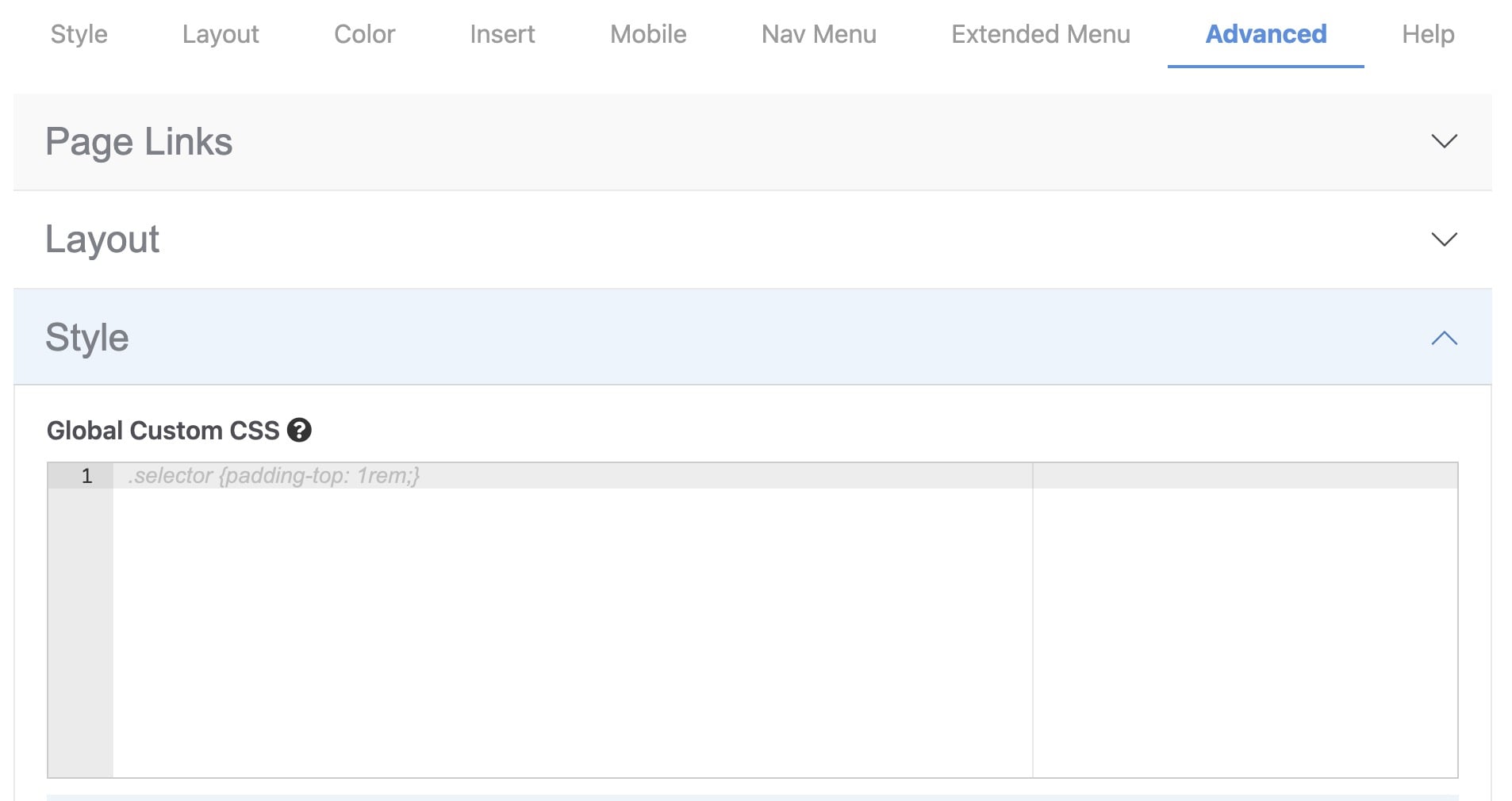 Designers can customize the styling of the menu or active theme without the need to modify the theme CSS file. This field is intended to be more general compared to the previous options. These customizations will apply regardless of your active site theme or Mega Menu skin. Recommended for tweaks/fixes for 3rd party blocks and themes.