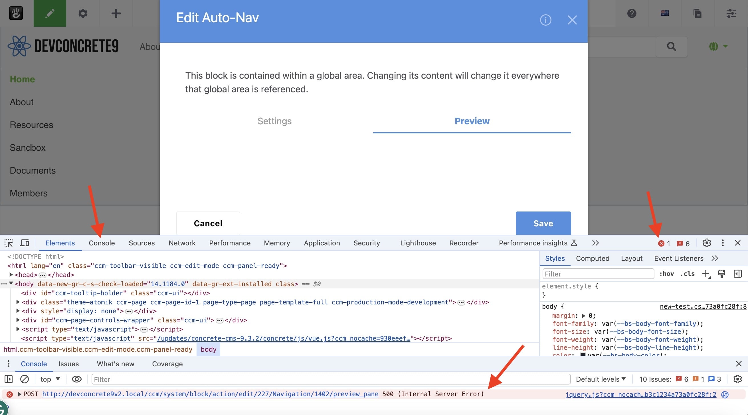 There’s a known bug in Concrete V9.0 – 9.3.4 that affects the “preview” feature in multiple blocks (including the core Autonav block). This occurs when the block is placed in a global area or stack. A workaround was proposed on Github and the bug has been fixed in 9.3.5.